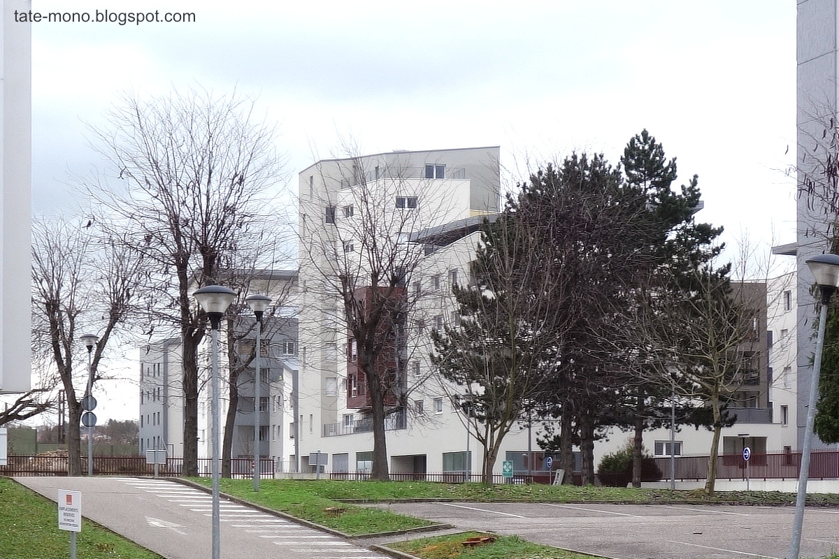 メッス市の駅の南側、アンフィテアトル再開発地区に建つ集合住宅。全140戸、延床面積はおおよそ12,800平米のプロジェクトで、外観からも想像がつくとおり、各住戸の間取りは大小さまざまヴァリエーションに富んでいます。「リュミエール」(光)の名が冠されているのにふさわしく、住居スペースに外光がたくさん取り入れられるようプランニングされているとのこと。