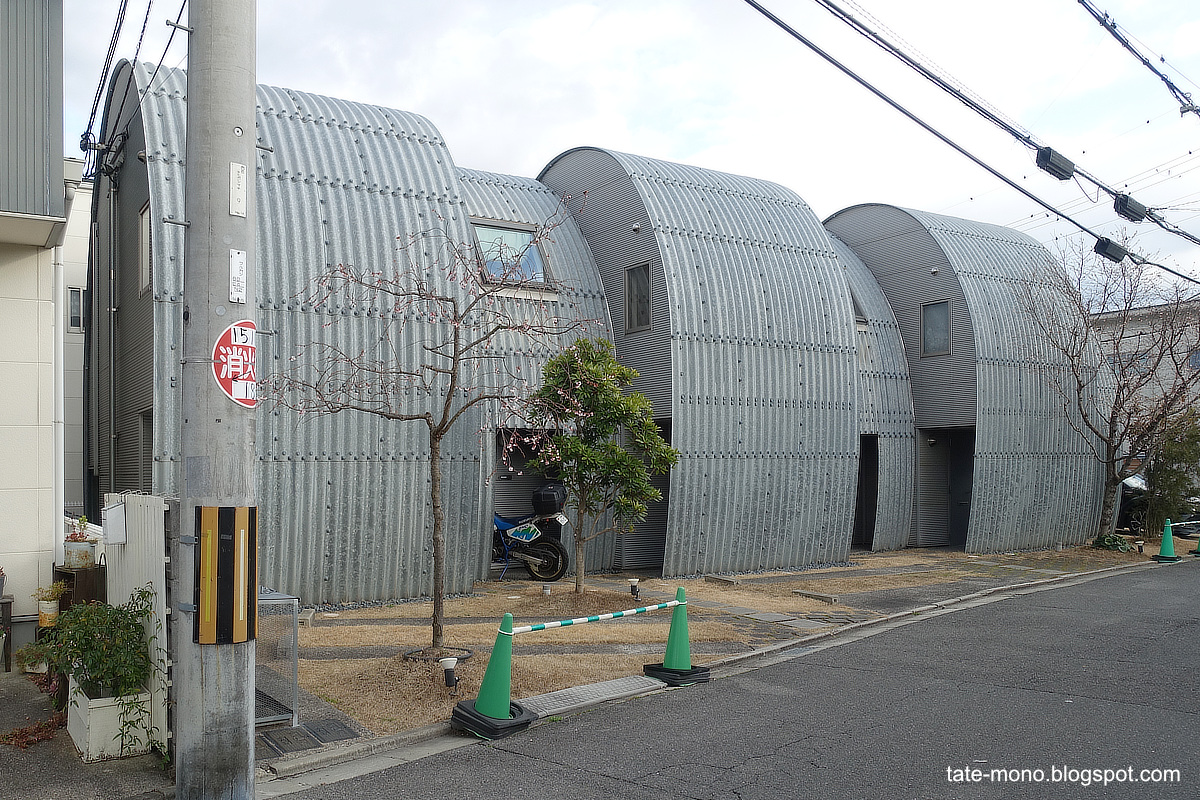 馬蹄型に曲げたコルゲート鋼板が屋根と壁になっている6戸と、箱型の基本的な形状の建物に入った4戸の、計10戸から構成されるプロジェクトです。施主の方のお名前がどうやら森さんであるらしく、だから「森の10居」というのか、と、いま納得しました。遠藤事務所独自の分類・表記では、この建築は「ルーフテクチャー」系の作品ということになるようです。